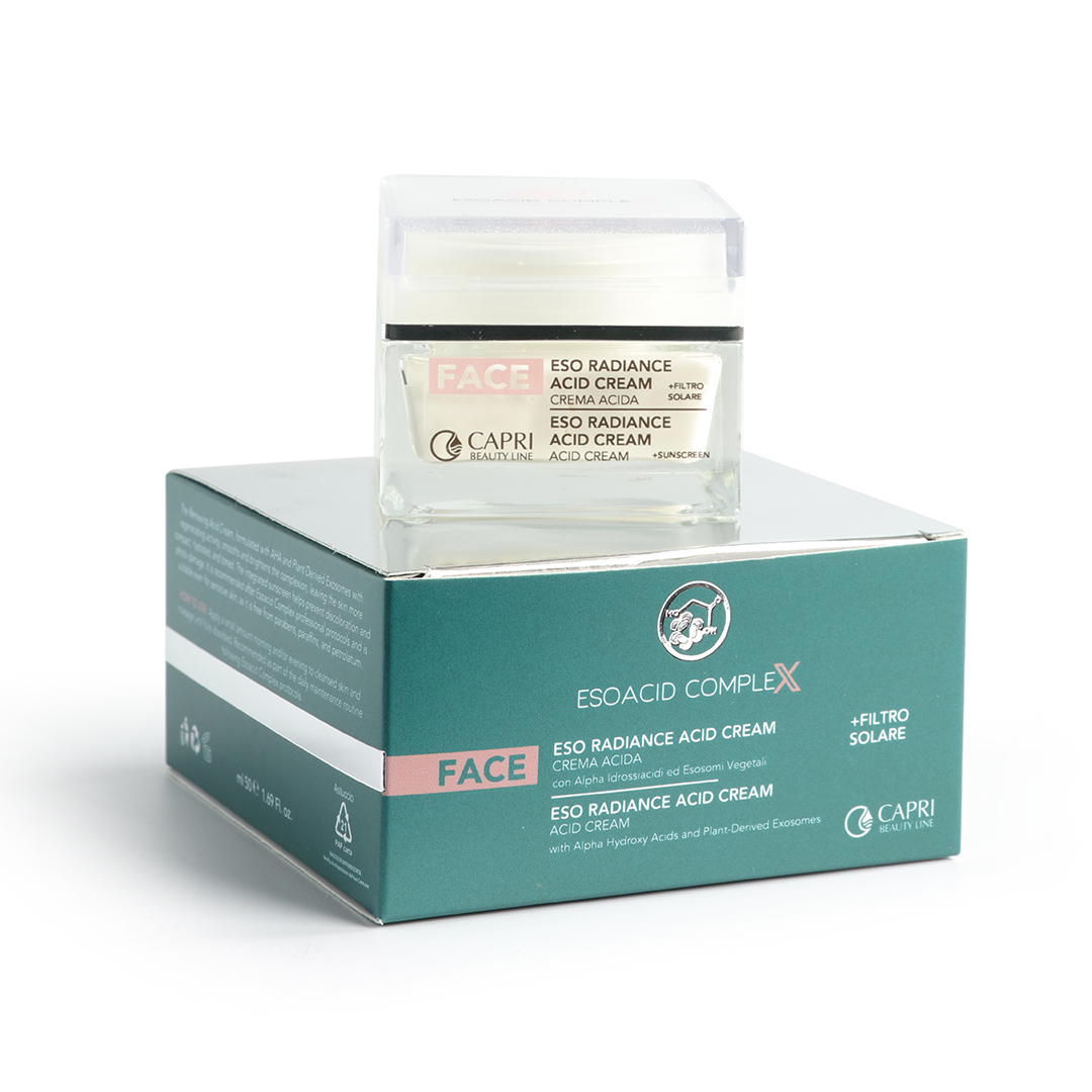 La Crema Acida rinnovante, formulata con un mix di Alpha Idrossiacidi ed Esosomi Vegetali ad attività rigenerativa, è studiata per migliorare luminosità, uniformità e qualità cutanea. Leviga, illumina e uniforma il colorito, lasciando un aspetto più compatto, idratato e tonico. Il filtro solare integrato inoltre, aiuta a prevenire discromie e fotodanneggiamento. Perfetta come mantenimento domiciliare dopo i protocolli professionali Esoacid Complex, può essere utilizzata anche dai soggetti più sensibili in quanto priva di Parabeni, Paraffine e Petrolati.
